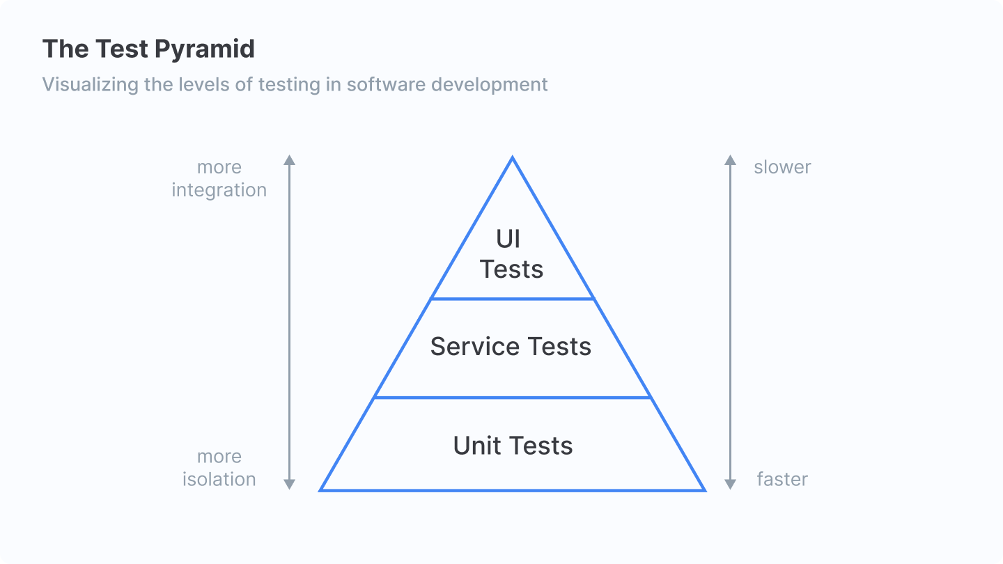 The test pyramid simplifies testing to three levels: unit tests, service tests, and UI tests. Although many people in the software development industry consider the test pyramid overly simplistic, it's a useful heuristic for understanding the tradeoffs between speed and integration.